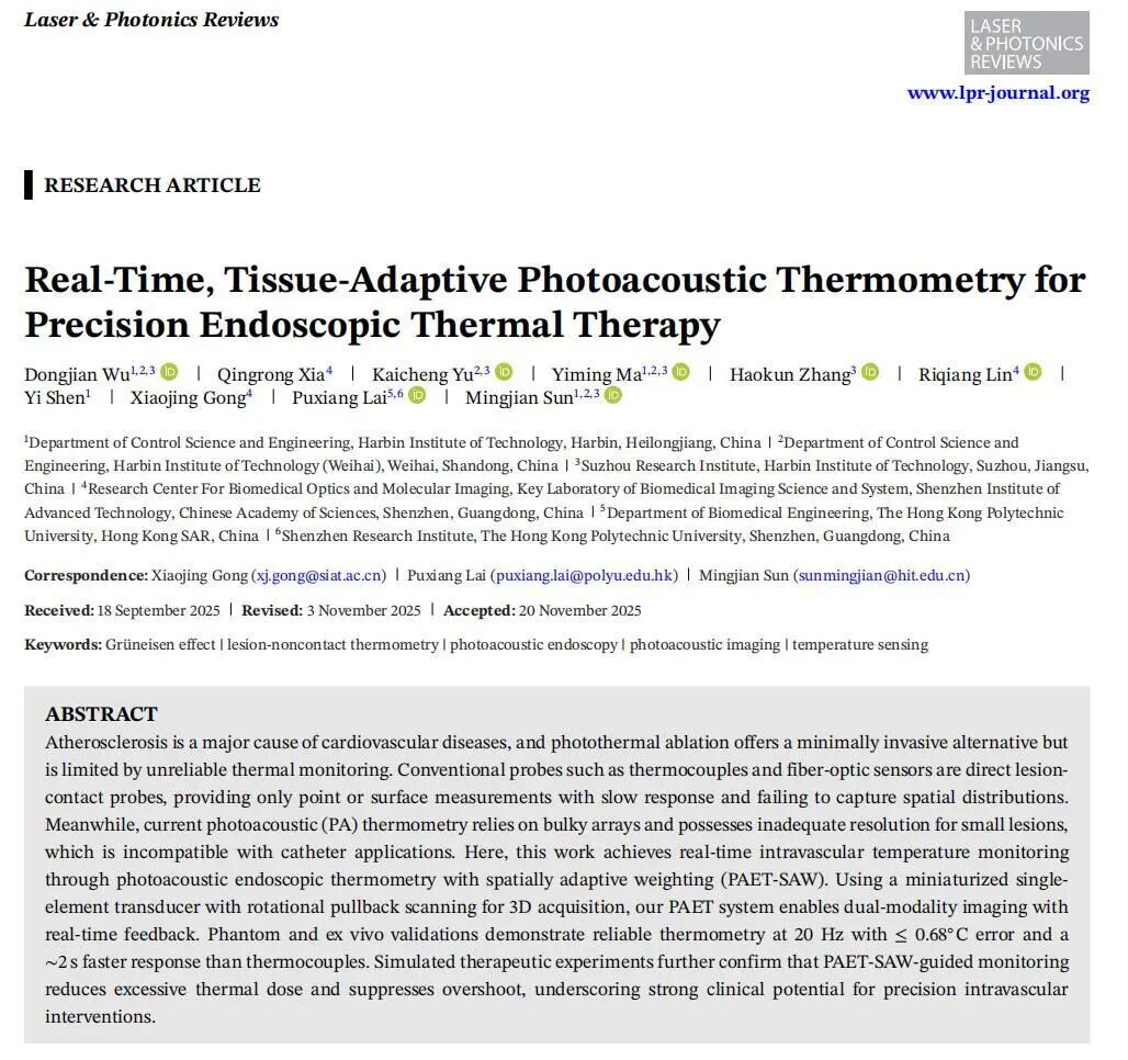 近日,研究院智慧医疗与健康团队联合中国科学院深圳先进技术研究院和香港理工大学,在光声内窥成像与介入热疗安全监测方向取得重要进展。团队提出“基于空间自适应加权的光声内窥测温策略及系统”(PAET-SAW and PAET system),实现了介入条件下血管腔内的实时、组织自适应高精度温度监测。相关成果以《面向介入精准光热治疗的光声实时组织自适应测温方法》(Real-Time, Tissue-Adaptive Photoacoustic Thermometry for Precision Endoscopic Thermal Therapy)为题发表于光学领域顶刊《激光与光子学评论》(Laser & Photonics Reviews)。