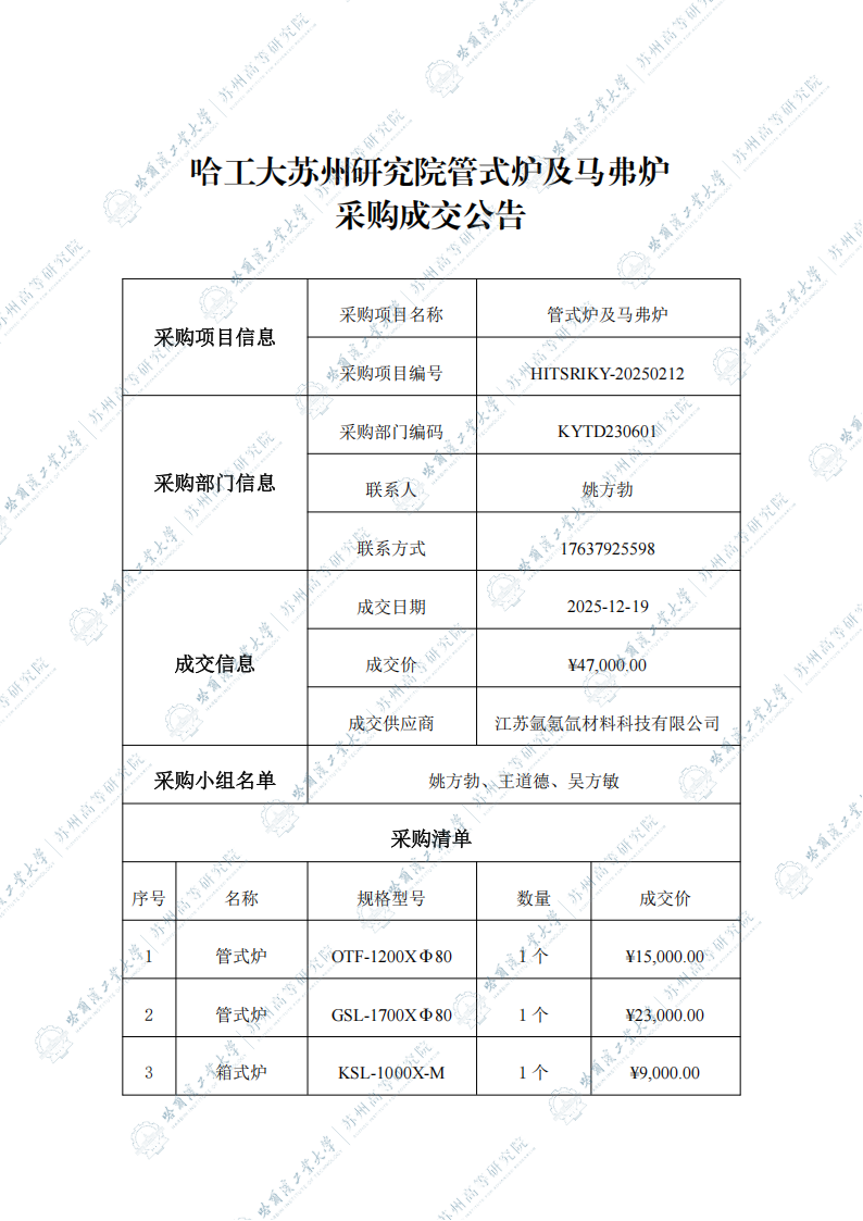 哈工大苏州研究院管式炉及马弗炉自行采购成交公告
