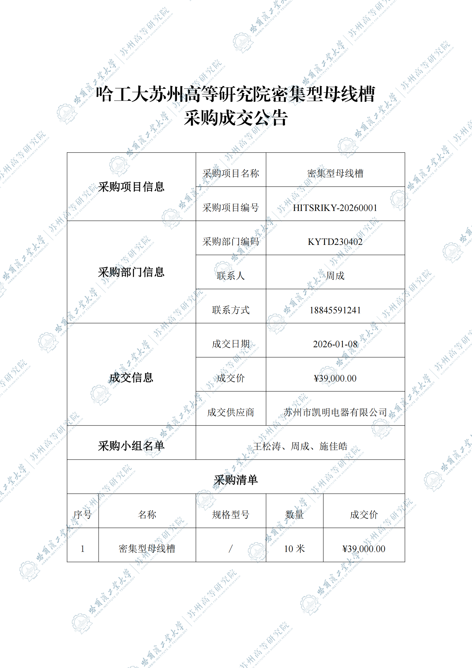 哈工大苏州高等研究院密集型母线槽自行采购成交公告