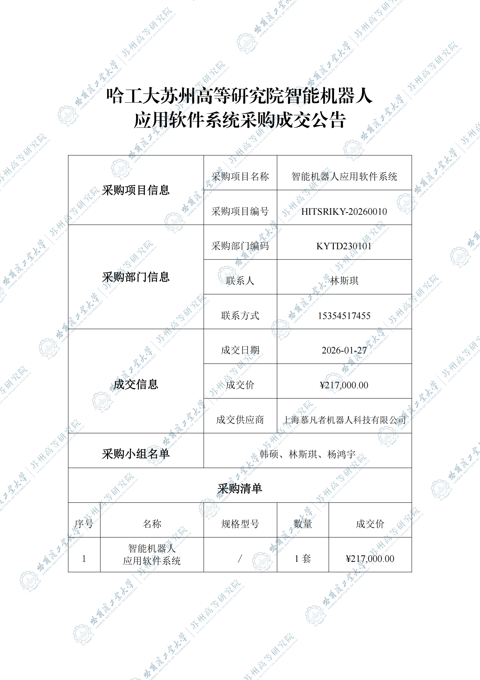 哈工大苏州高等研究院智能机器人应用软件系统自行采购成交公告