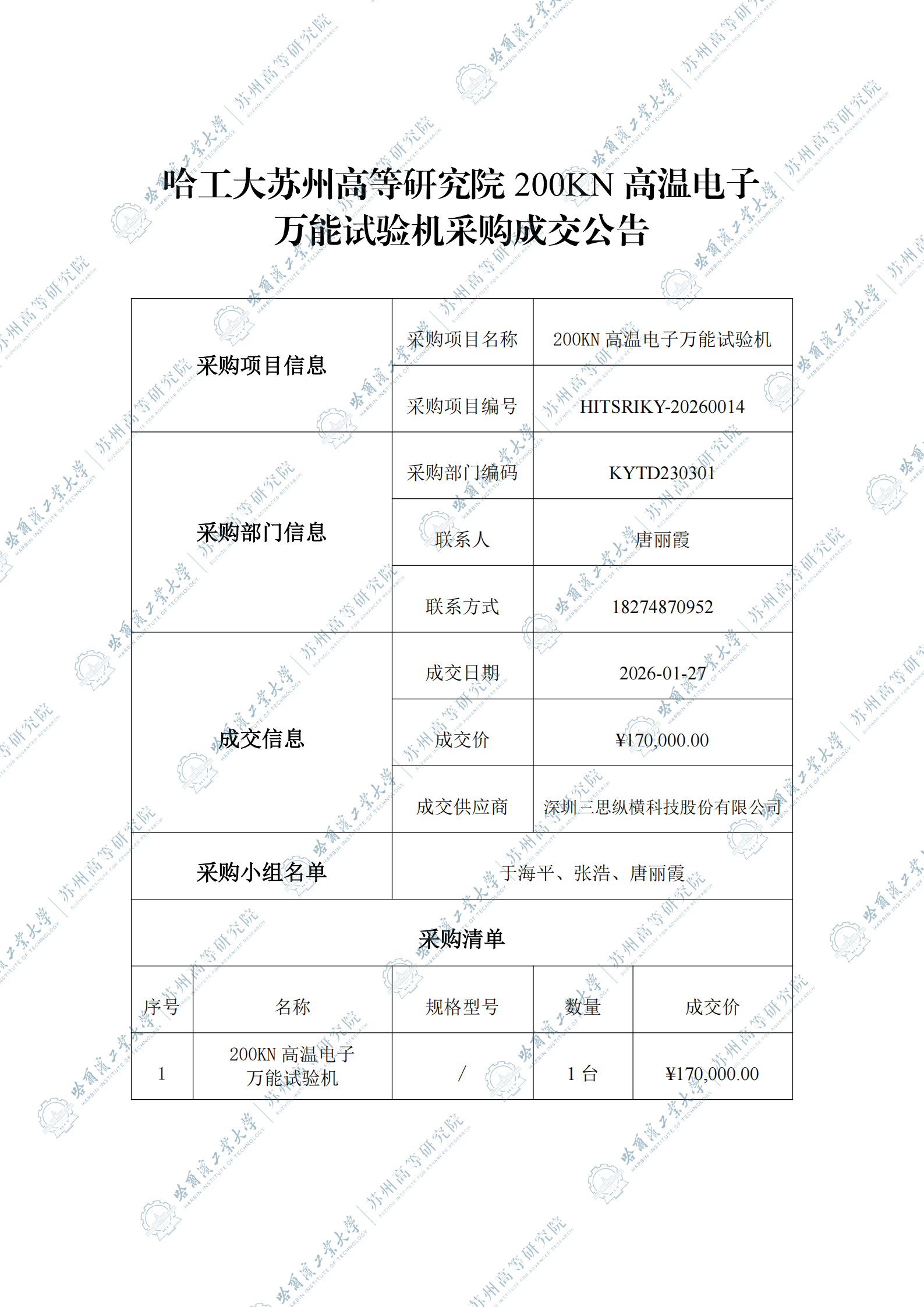 哈工大苏州高等研究院200KN高温电子万能试验机自行采购成交公告