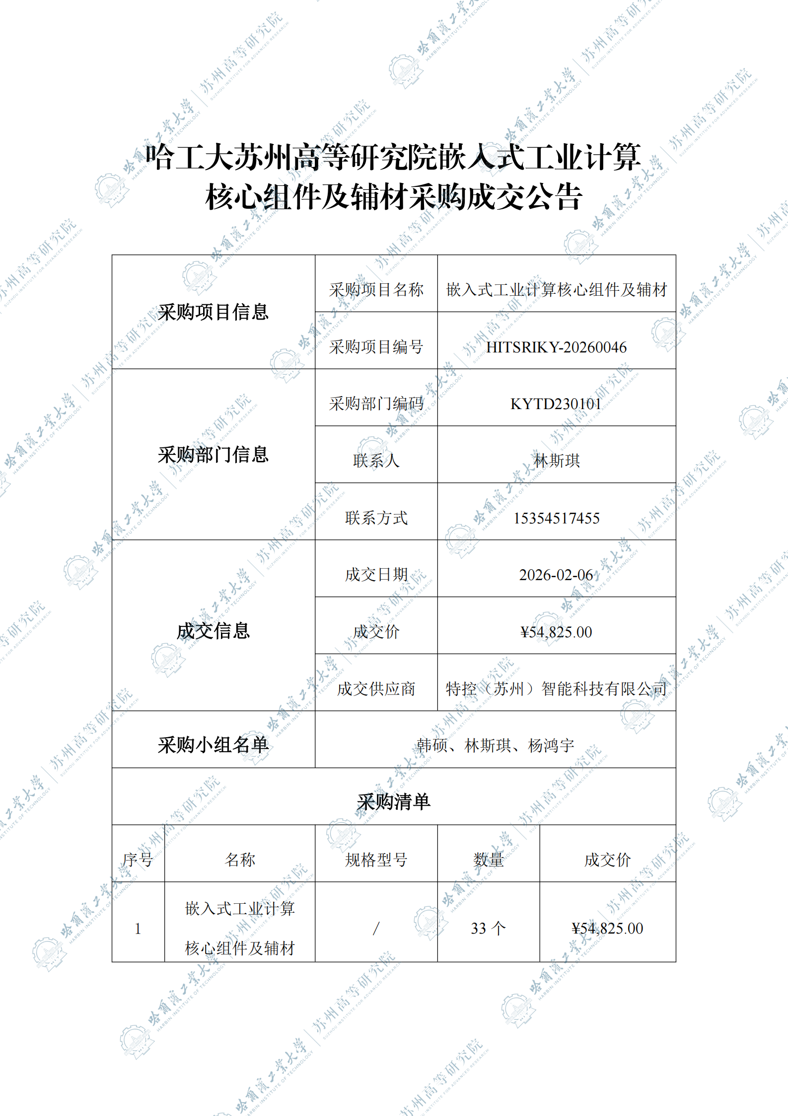 哈工大苏州高等研究院嵌入式工业计算核心组件及辅材自行采购成交公告