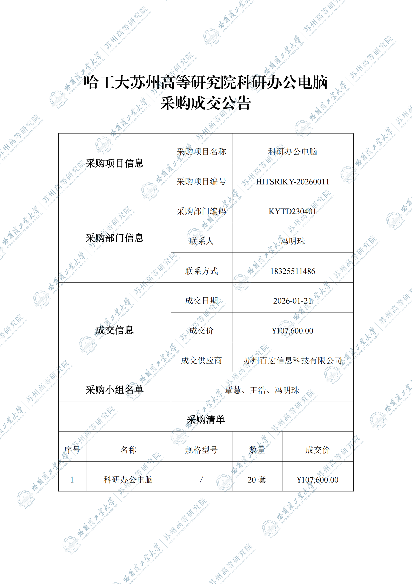 哈工大苏州高等研究院科研办公电脑自行采购成交公告