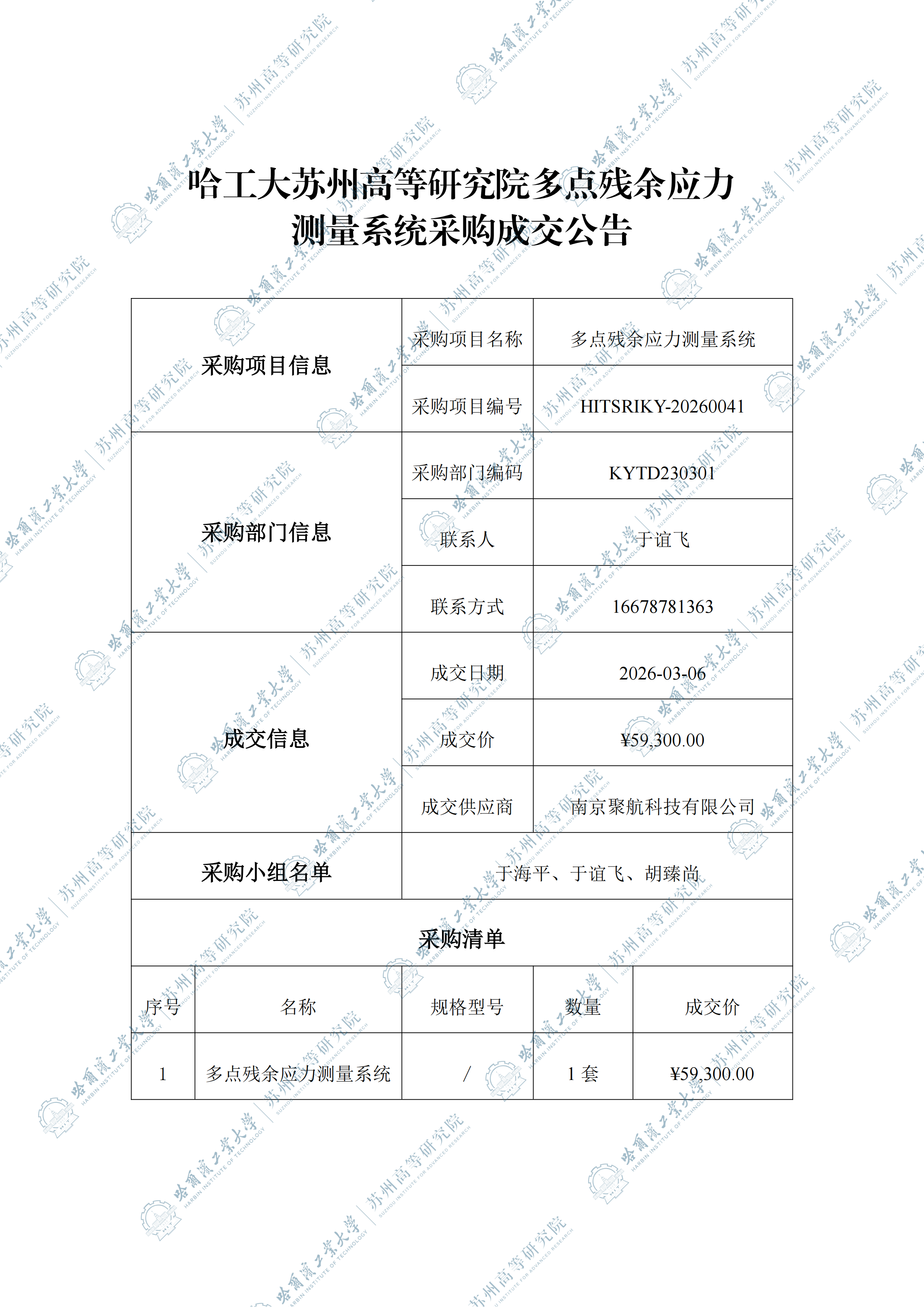 哈工大苏州高等研究院多点残余应力测量系统自行采购成交公告