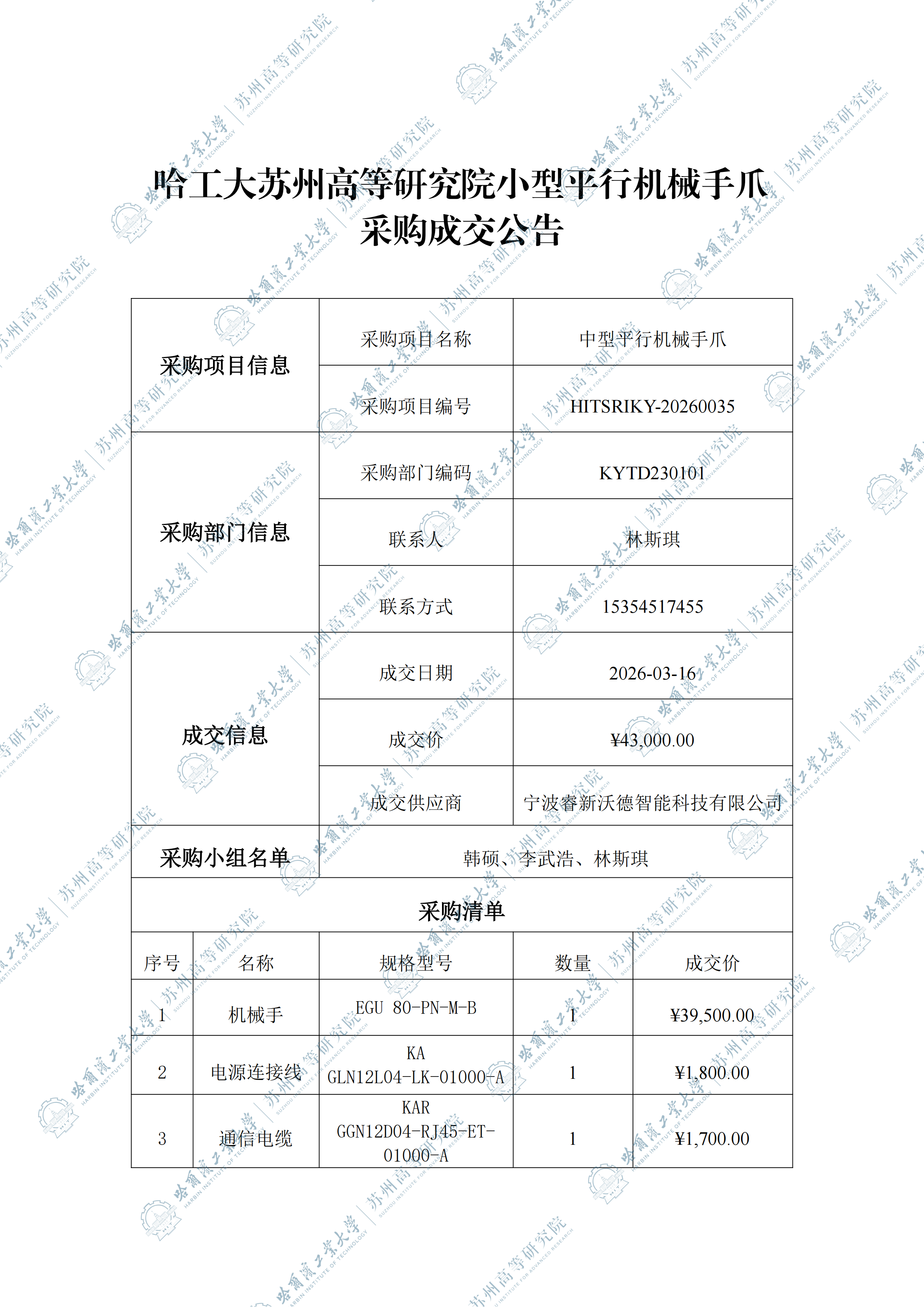 哈工大苏州高等研究院中型平行机械手爪自行采购成交公告