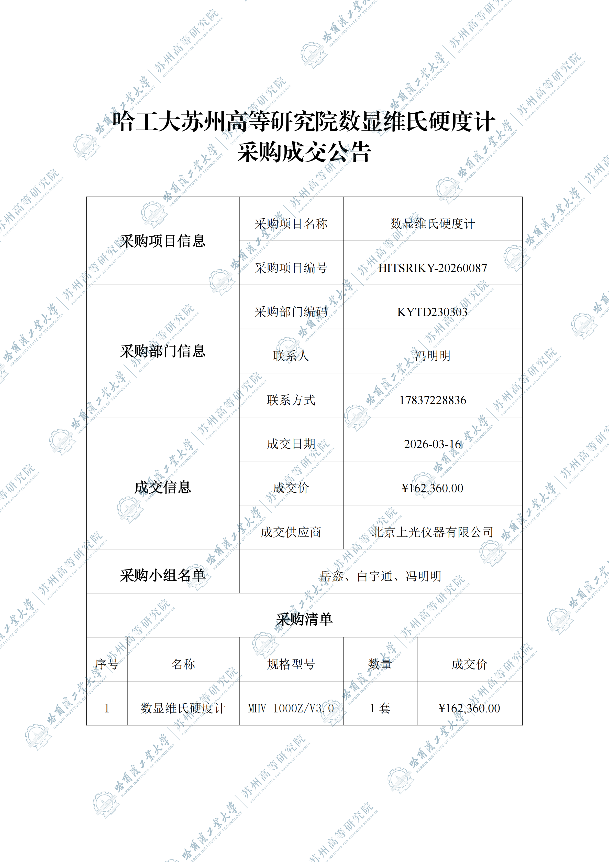哈工大苏州高等研究院数显维氏硬度计自行采购成交公告