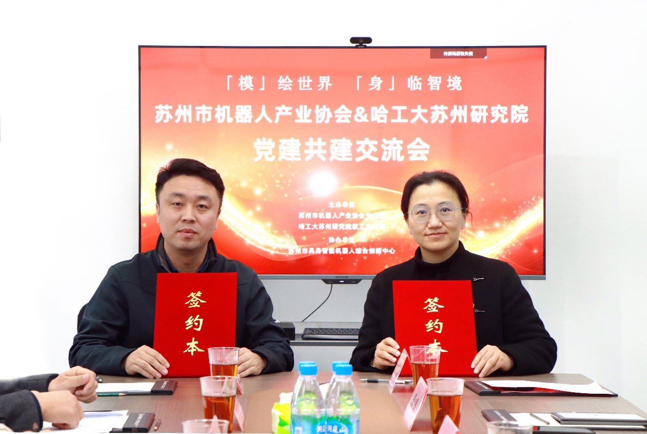 会上,研究院教工党支部书记覃慧与苏州市机器人产业协会党支部书记杨文龙正式签署党建共建协议。双方将围绕组织建设、资源共享和产学研融合发展构建常态化合作机制,致力于通过党建纽带激发创新活力,实现技术与产业的双向赋能。