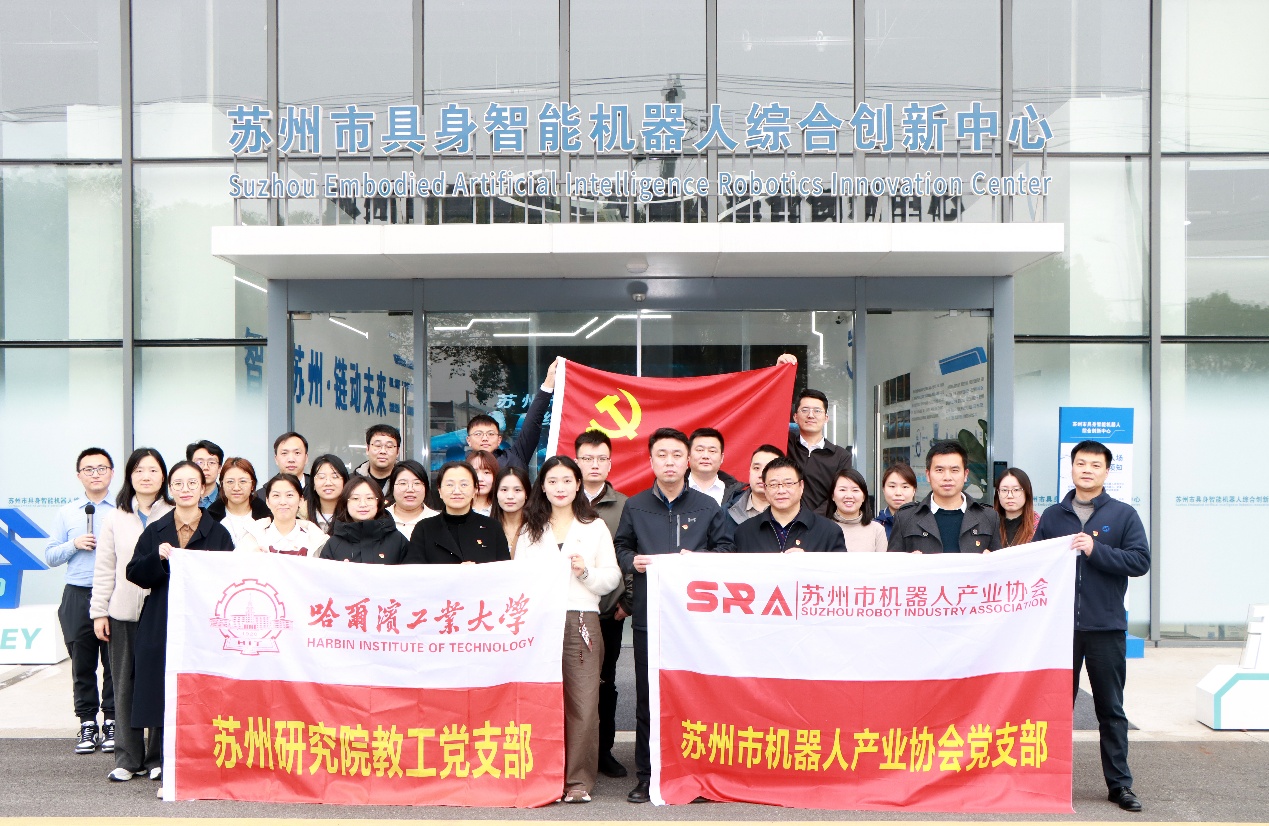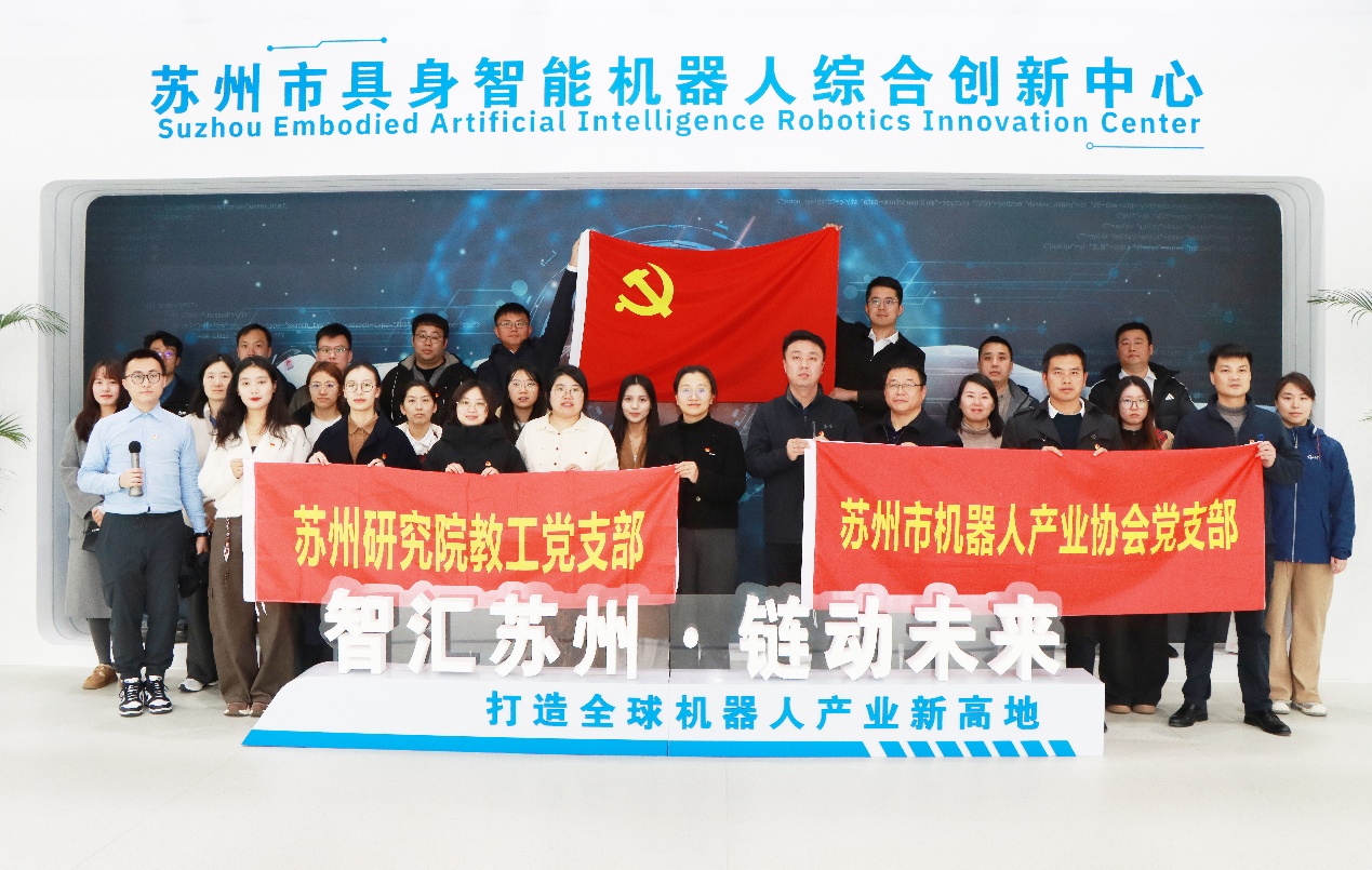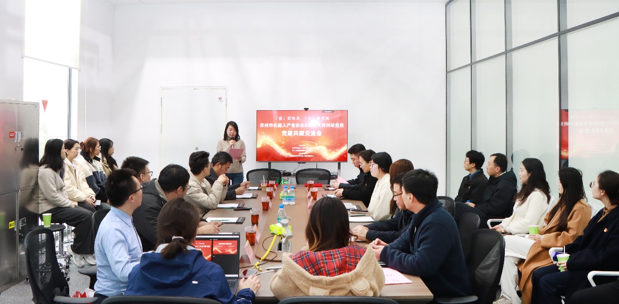 3月20日下午,研究院教工党支部与苏州市机器人产业协会党支部在苏州市具身智能机器人综合创新中心举办党建共建交流会。本次活动以"‘模’绘世界,‘身’临智境”为主题,来自苏州市机器人行业协会、科研院所的党员代表及特邀嘉宾等20余人参会,活动围绕党建引领机器人产业高质量发展进行深入交流。
