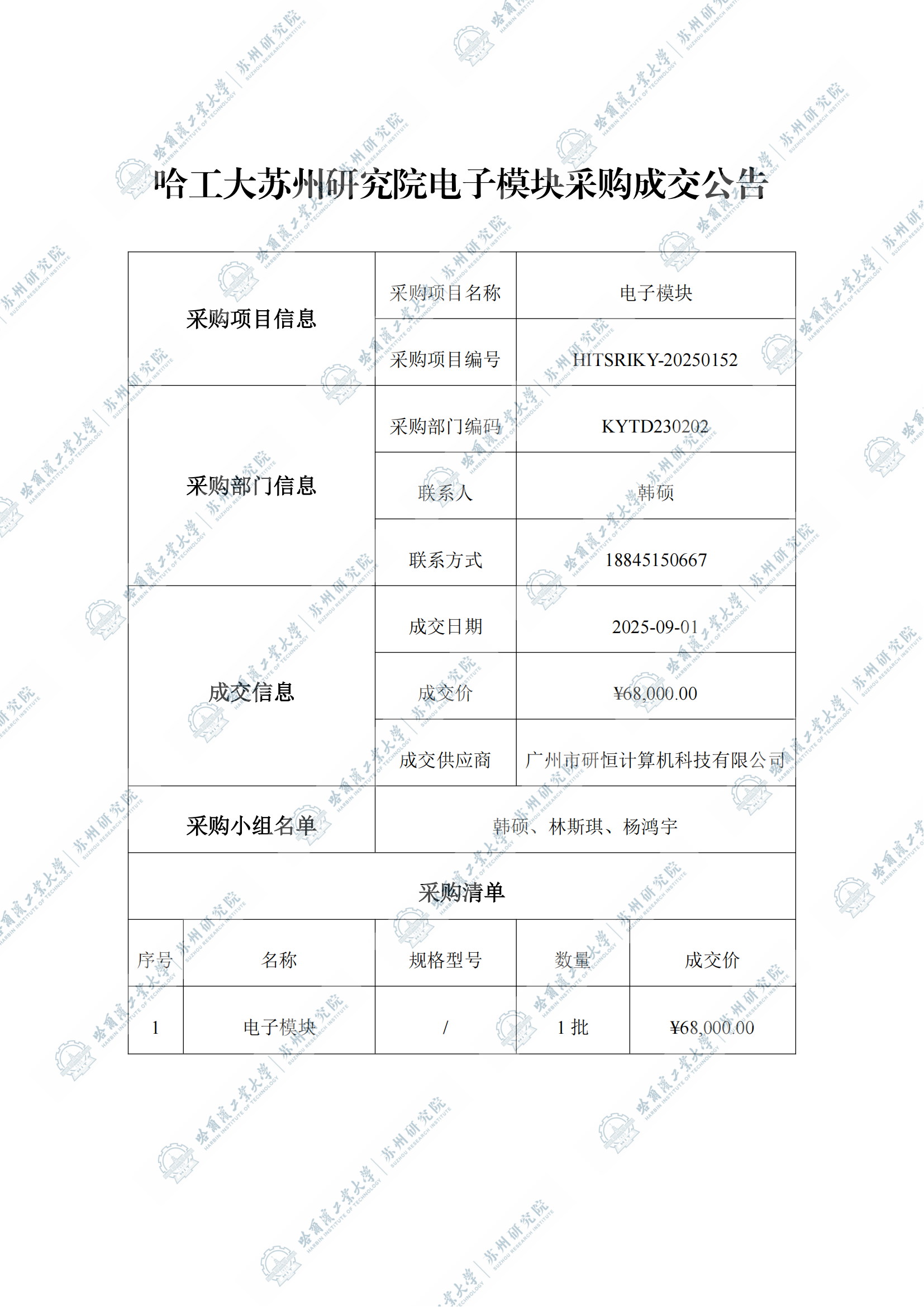 哈工大苏州研究院电子模块自行采购成交公告