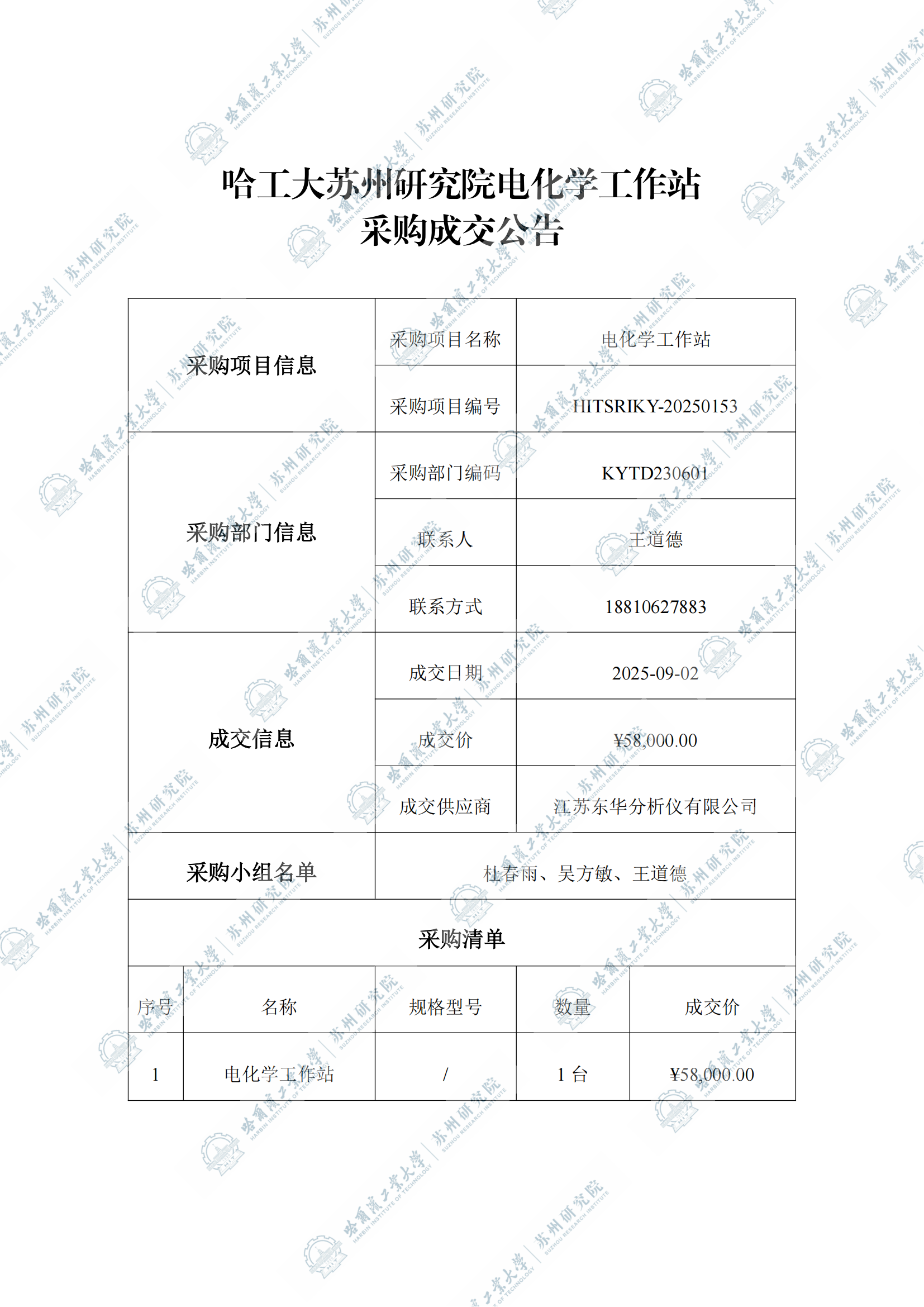 哈工大苏州研究院电化学工作站自行采购成交公告