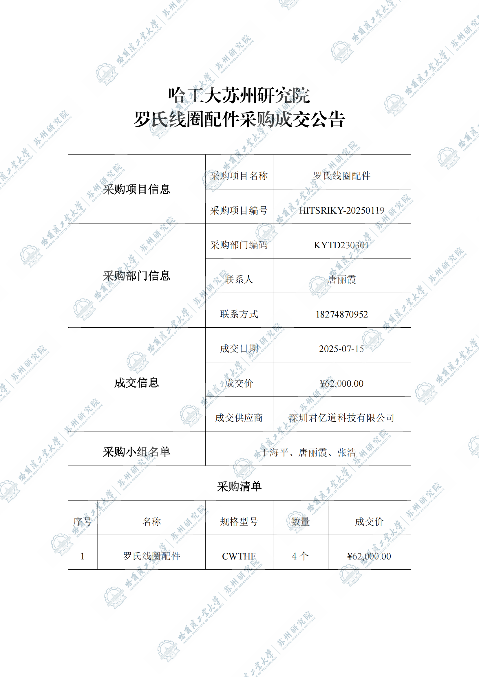 哈工大苏州研究院罗氏线圈配件自行采购成交公告