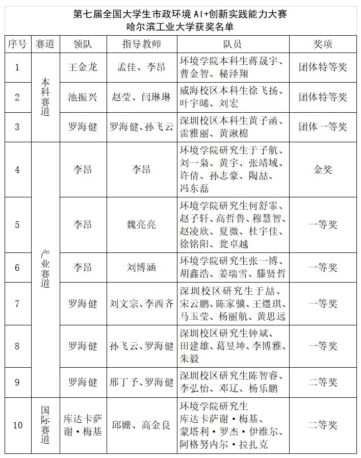 哈工大全媒体(商艳凯 郭亮/文 环境学院/图)近日,第七届全国大学生市政环境AI+创新实践能力大赛全国决赛在海南三亚举行。我校参赛学子共斩获金奖1项、特等奖2项、一等奖5项及二等奖2项。获奖团队学生分别来自环境学院、威海校区和深圳校区。