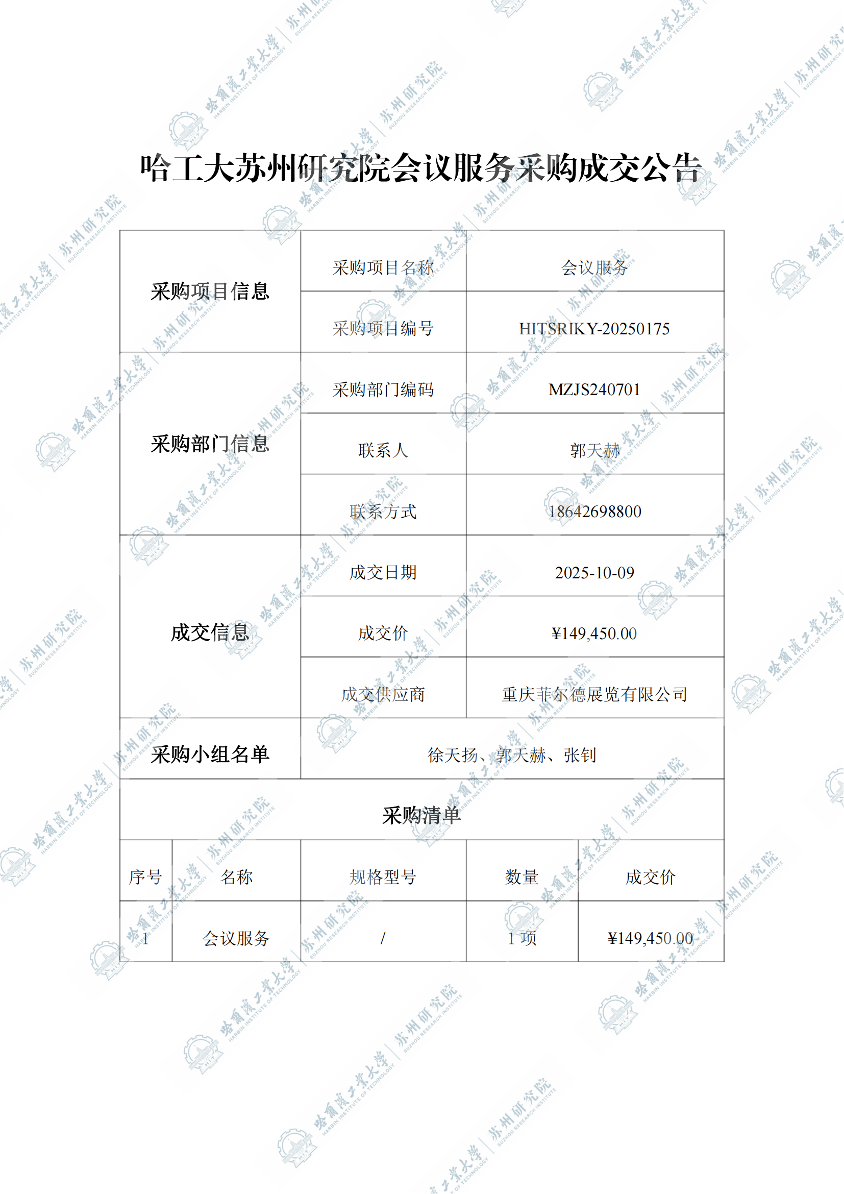 哈工大苏州研究院会议服务自行采购成交公告