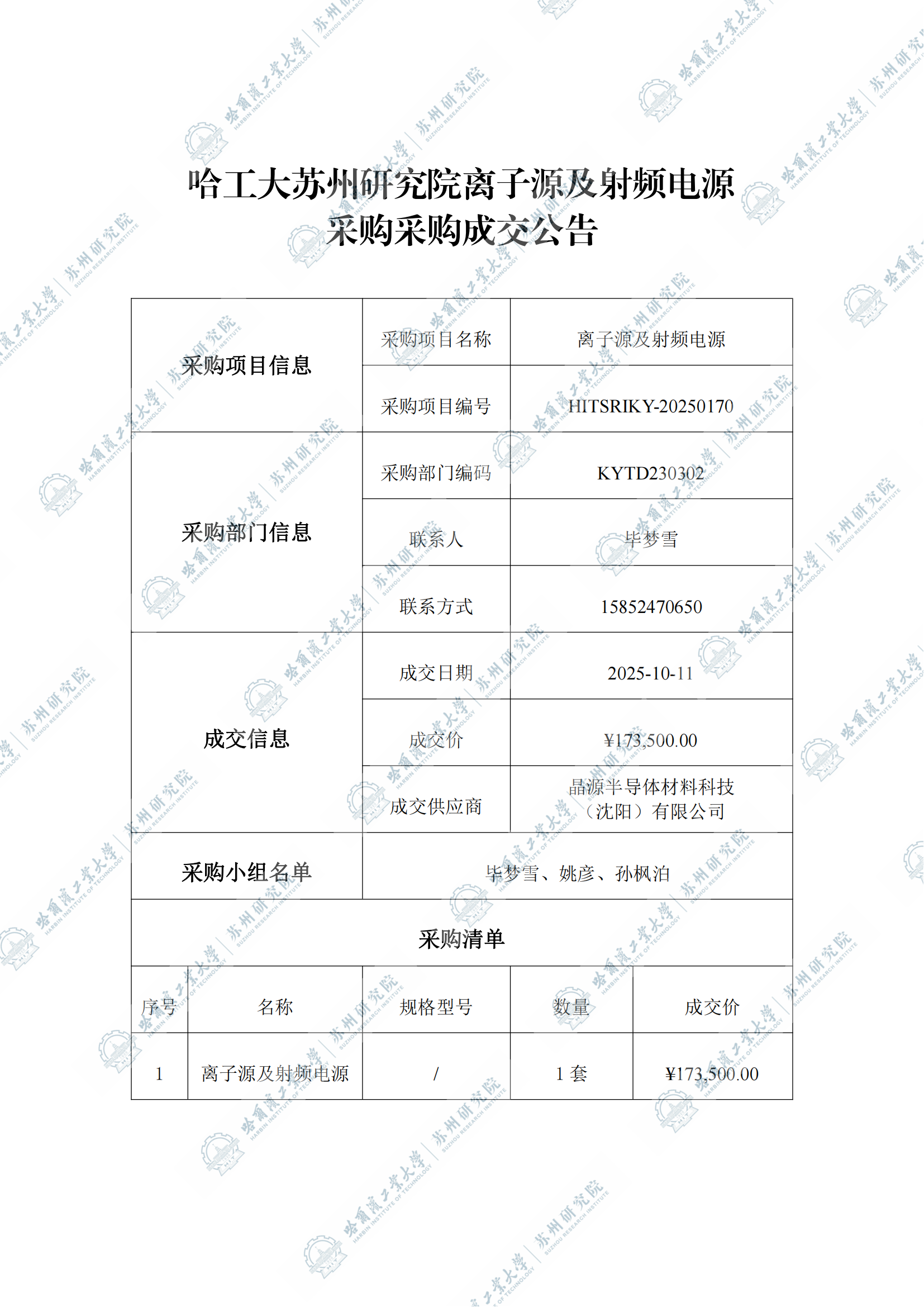 哈工大苏州研究院离子源及射频电源自行采购成交公告