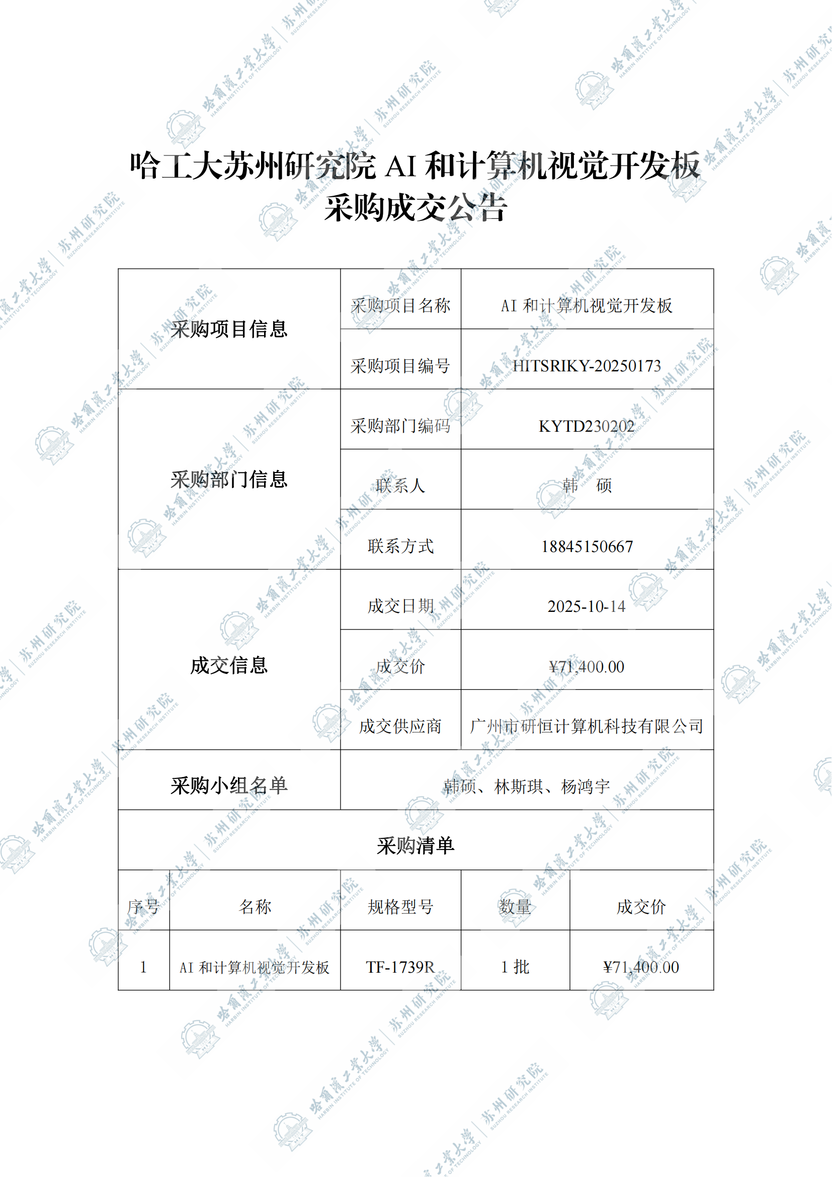 哈工大苏州研究院AI和计算机视觉开发板自行采购成交公告