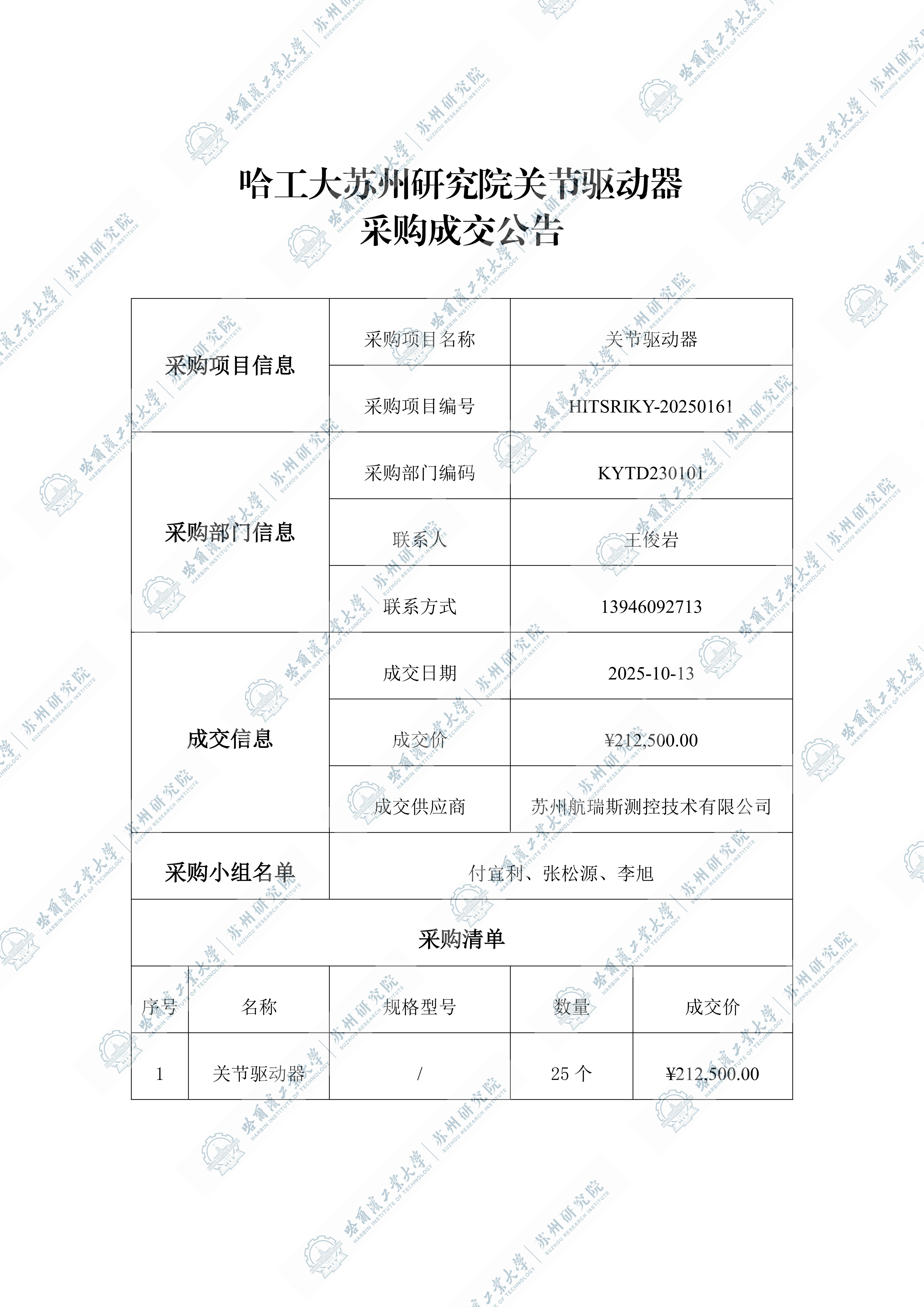 哈工大苏州研究院关节驱动器自行采购成交公告