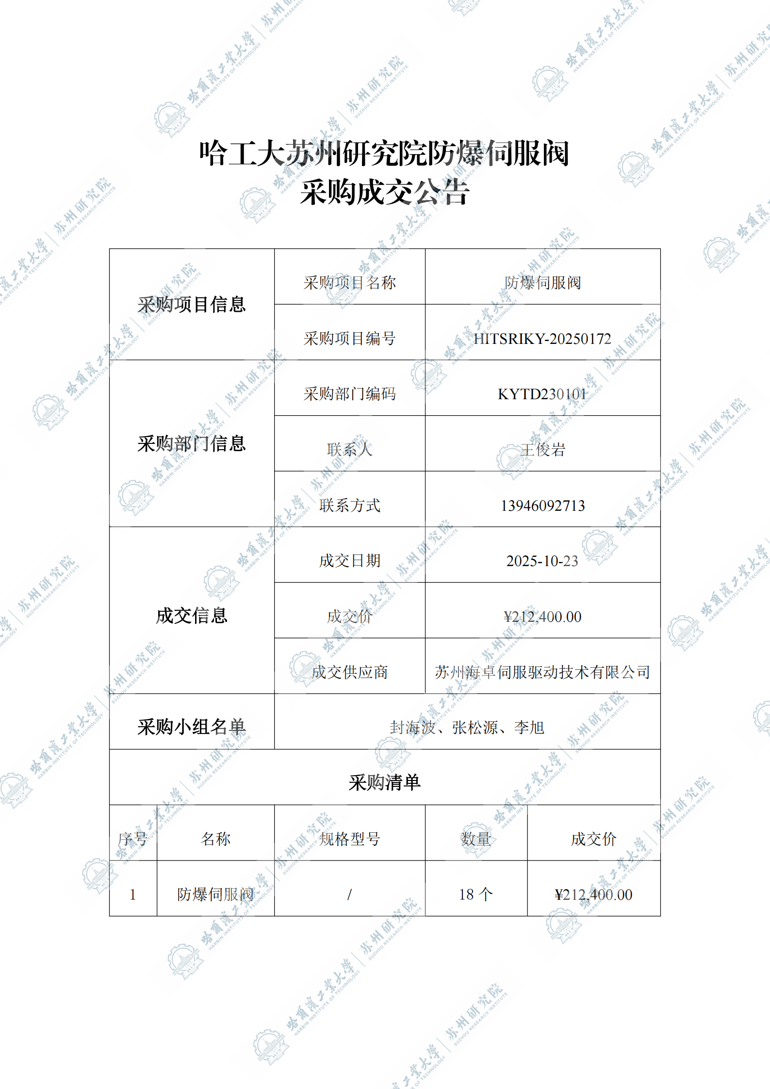 哈工大苏州研究院防爆伺服阀自行采购成交公告