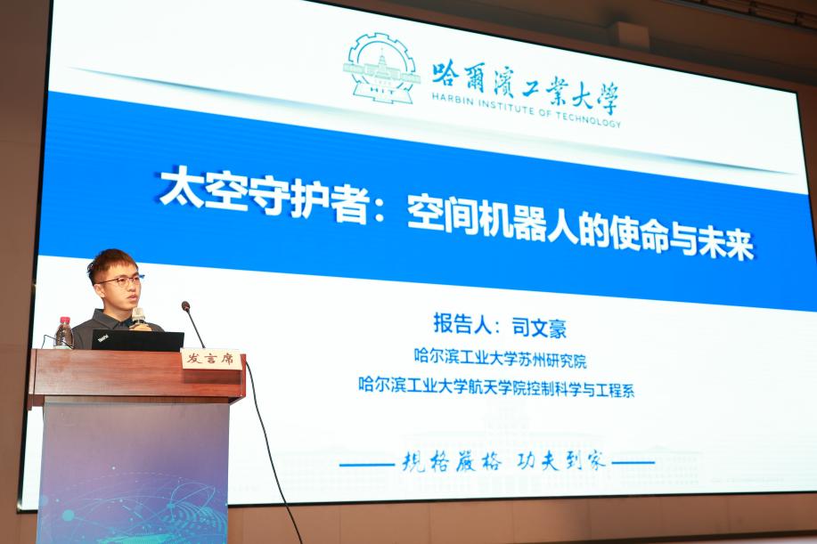 本次主讲人是哈工大苏州专项2024级控制学科硕士研究生司文豪。他以通俗易懂的语言,为中学生们讲述了空间机器人进行太空探测和空间站维护的故事。通过“太空清洁工”“太空医生”等生动比喻,结合空间站机械臂和舱内飞行机器人等科研成果,带领同学们探寻了极端太空环境下空间机器人是如何工作的。