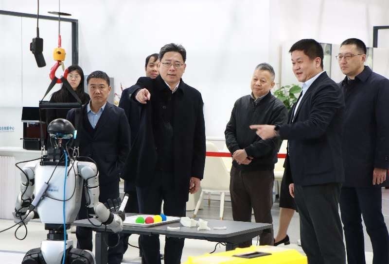 在训练场、实验室和生产基地,郭君巍向金晓明详细介绍了研究院在人工智能等前沿领域的技术攻关模式和重要科研成果。金晓明重点了解了人形机器人通用自主导航技术、空天飞行器、智能机械臂、小苏机器导盲犬等项目进展情况。