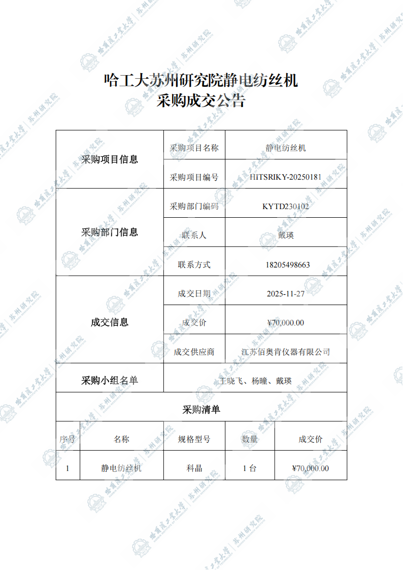 哈工大苏州研究院静电纺丝机自行采购成交公告