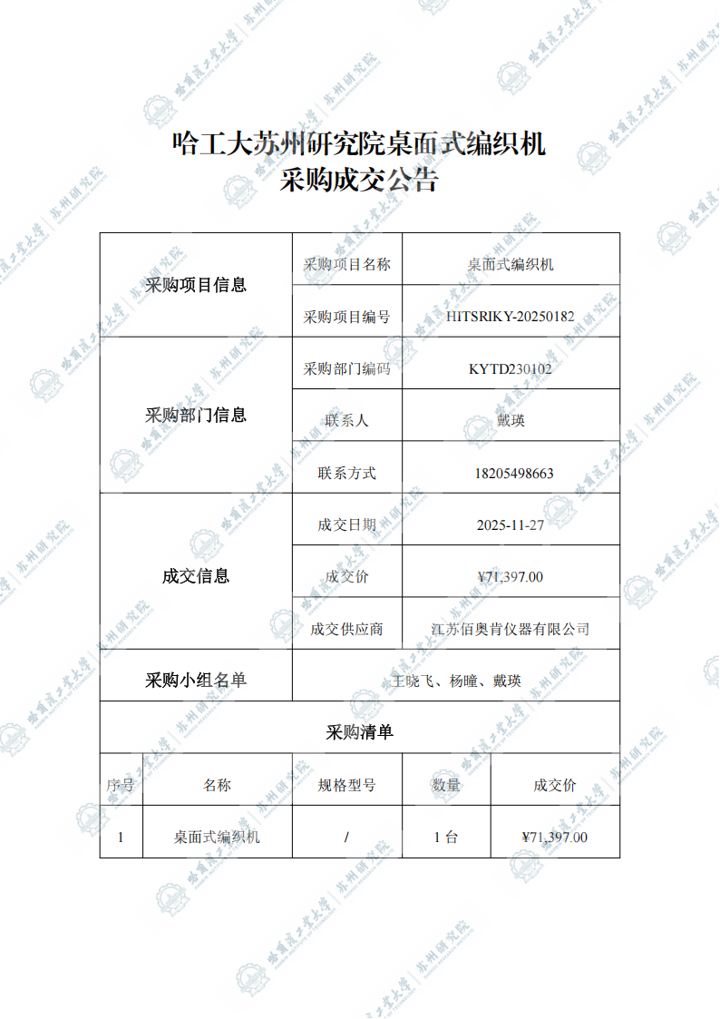 哈工大苏州研究院桌面式编织机自行采购成交公告