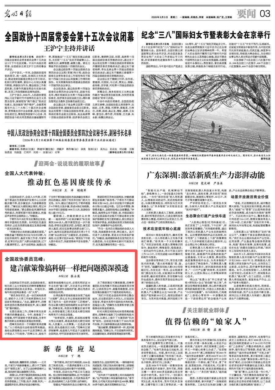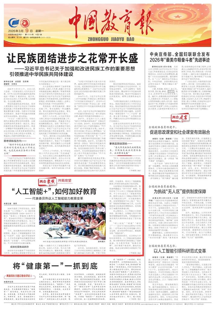 3月5日,《中国教育报》刊发《凝聚智慧 凝聚力量——全国政协十四届四次会议开幕侧记》,报道全国政协委员、我校校长助理吴立刚在全国两会上建真言、谋良策,以高质量议政建言成果服务和助力“十五五”开好局、起好步。