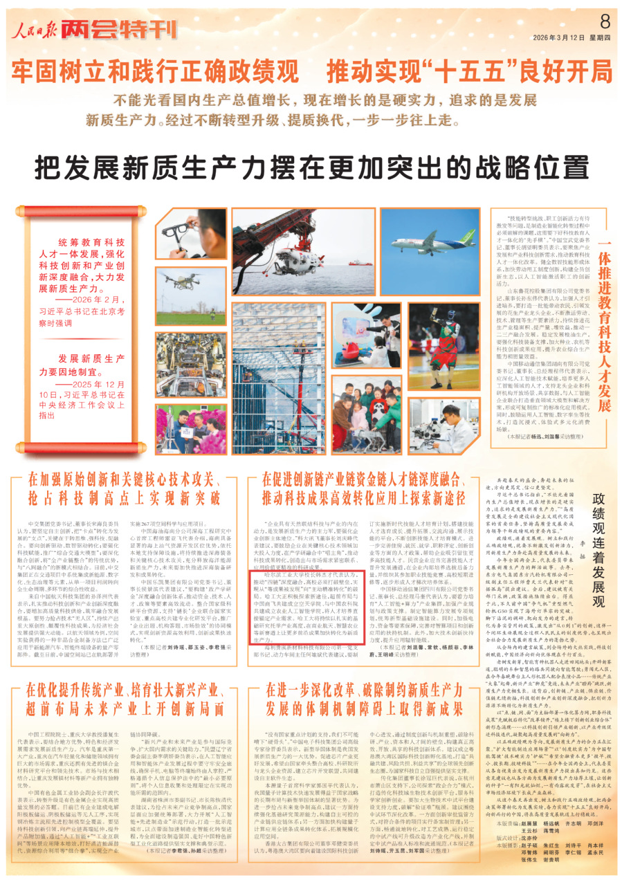 今年政府工作报告将“加快高水平科技自立自强”和“加紧培育壮大新动能”列为重点任务,提出“推动科技创新和产业创新深度融合”。全国人大代表、哈尔滨工业大学校长韩杰才表示,高校应发挥“尖兵”作用,促进创新链与产业链无缝对接,为培育新质生产力、建设现代化产业体系提供坚实支撑。
