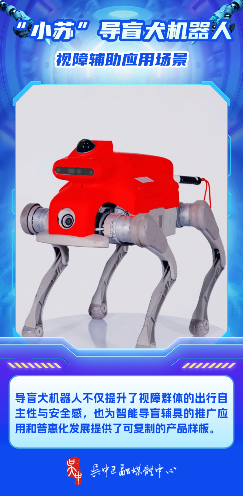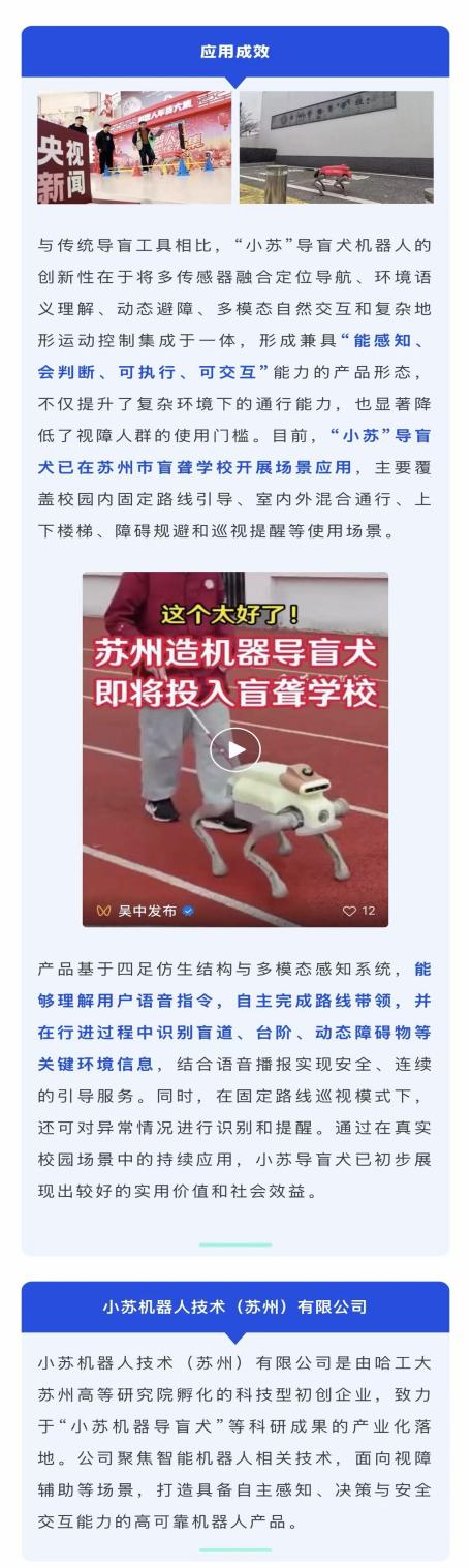 吴中发布推出《一“犬”守护,无碍前行丨场景创新看吴中》专题报道,关注导盲犬项目在科技助残领域的场景创新与实践成效。在应用层面,“小苏”已在苏州市盲聋学校完成两个多月驻点测试与优化,能够稳定运行于教室、食堂及校园室内外等多种场景,覆盖路线引导、上下楼梯、障碍规避等实际需求。同时,产品搭载语音交互与智能陪伴功能,进一步拓展服务内涵,推动导盲工具向综合服务载体升级。