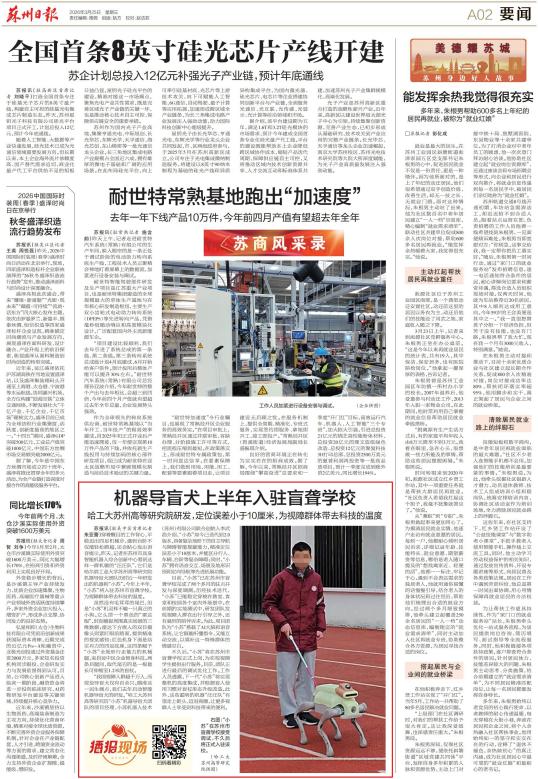 近日,苏州日报头版聚焦报道研究院在具身智能领域科研攻关新进展——机器导盲犬“小苏”进入应用阶段,计划于今年上半年入驻苏州市盲聋学校开展服务。报道指出,围绕视障人群出行这一现实需求,研究院机器导盲犬团队持续开展技术攻关,推出“小苏”2.0版本。针对我国视障人群规模庞大、传统导盲犬供给不足等问题,项目以具身智能为核心路径,融合多源感知与智能算法,结合四足仿生结构与复杂地形运动控制能力,实现自主导航与动态避障一体化。产品定位误差控制在10厘米以内,可对行人、车辆、台阶等多类环境要素进行精准识别,在复杂环境中具备良好的通行稳定性与安全性。该项目聚焦视障群体实际需求,在提升出行安全性的同时,也为科技成果加速走向民生应用提供了有力支撑。
