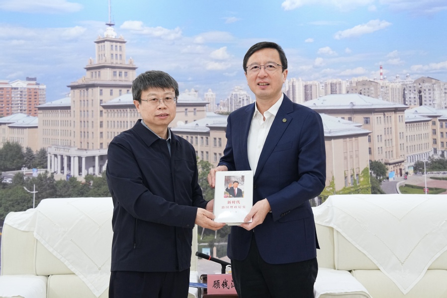 哈工大全媒体(李双余/文 辛然/图)4月2日,新华社黑龙江分社社长、分党组书记顾钱江来校,向我校党委书记陈杰、校长韩杰才转交《新时代治国理政纪实》第一卷(中英文版)。校党委常务副书记孙雪参加会见。