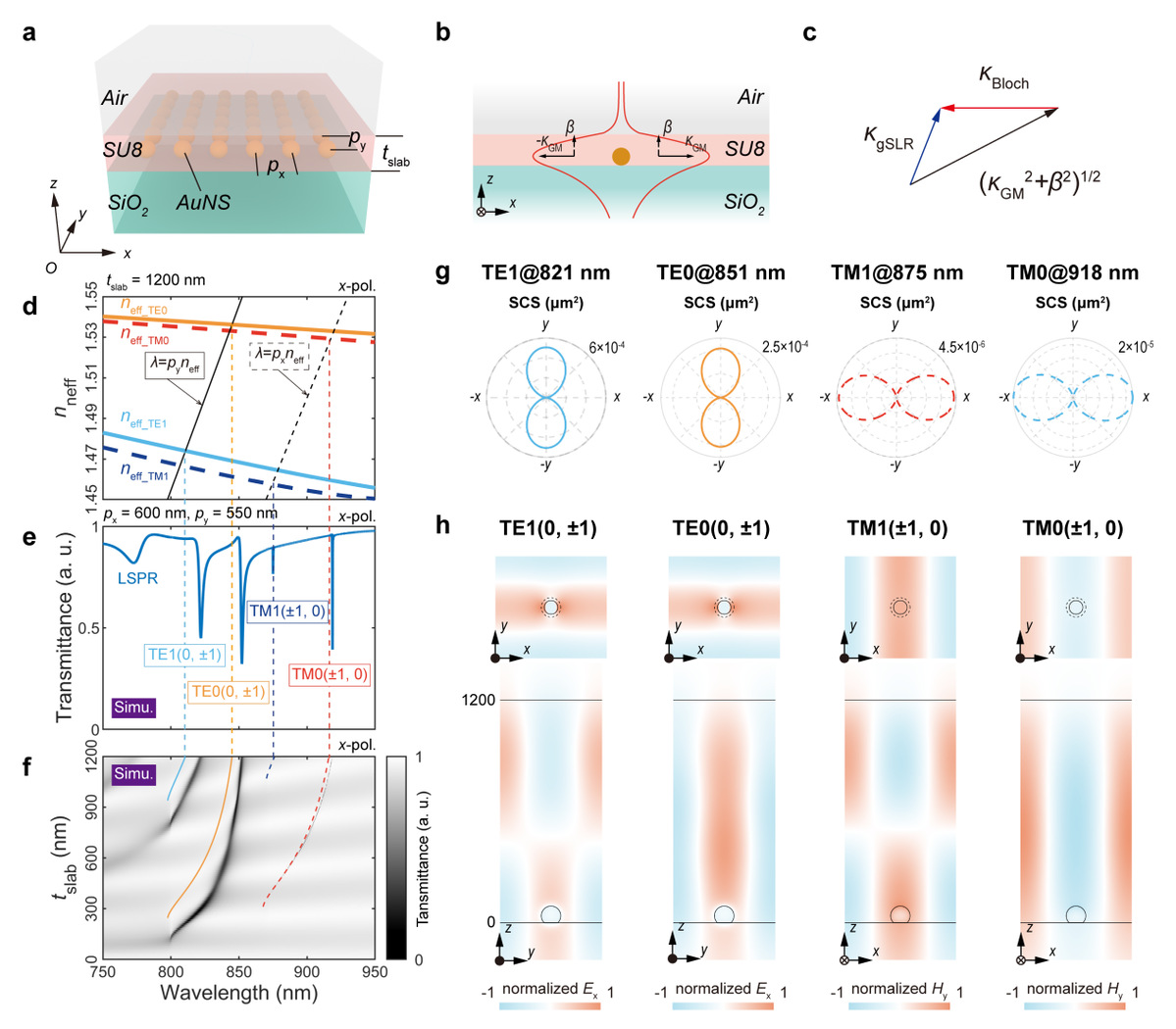 针对这一问题,团队深入探究了非连续电介质环境中表面晶格共振超表面难以实现高Q值的核心理论成因,创新性提出一种导模晶格共振构型。该构型通过将纳米颗粒超晶格嵌入平板波导,借助波导对纳米颗粒远场辐射方向图的精准调控,有效增强纳米颗粒之间的耦合作用,最终在非连续电介质环境中成功实现高Q值导模晶格共振。通过调控波导中导模模态的数量,还可在不改变超晶格构型的前提下,实现多模态共振,为多波长光-物质相互作用的相关研究提供了便捷路径。