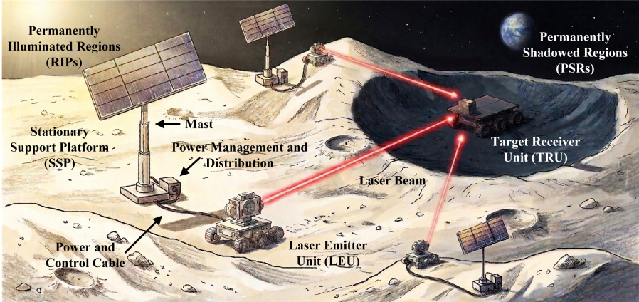 哈工大全媒体(李双余 郭朋真 李丽芳/文 田梦凡/图)近日,国家重大科技基础设施“空间环境地面模拟装置”地外天体环境物理与探测团队在月球永久阴影区激光供能领域取得重要进展,受邀在《航空航天科学进展》(Progress in Aerospace Sciences)发表长篇综述论文《面向月球探测的月表激光无线能量传输:前景、挑战与展望》(Surface-to-Surface Laser Wireless Power Transmission for Lunar Exploration: Prospects, Challenges and Perspectives)。文章围绕月球永久阴影区探测装备能源保障,系统梳理月表激光无线功率传输的关键科学问题与工程实现路径。