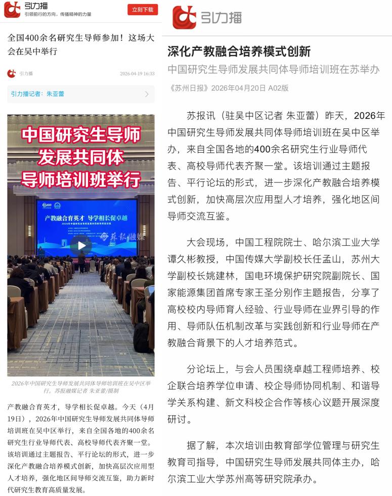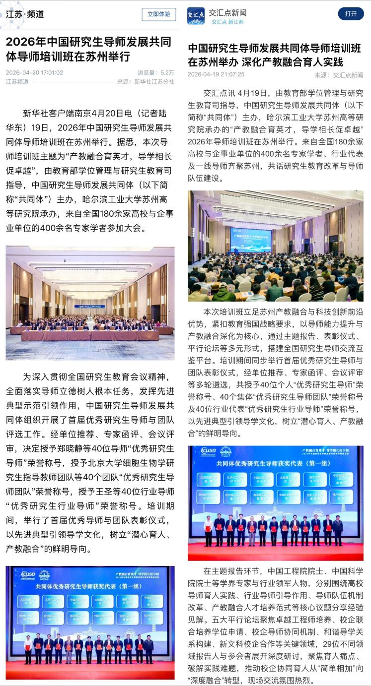 4月20日,新华社客户端、新华日报“交汇点新闻”、苏州日报“引力播”和苏州日报主版,先后报道2026年中国研究生导师发展共同体导师培训班系列活动。